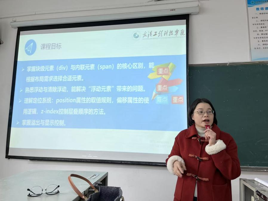 示范课聚焦前端核心技术“元素布局控制”,内容涵盖标准流、显示模式、浮动定位等核心知识点。刘小娇老师的课堂并未停留在技术传授层面,而是巧妙地将看似抽象的代码规则与深刻的育人内涵相联结,实现了知识传授与价值引领的同频共振。