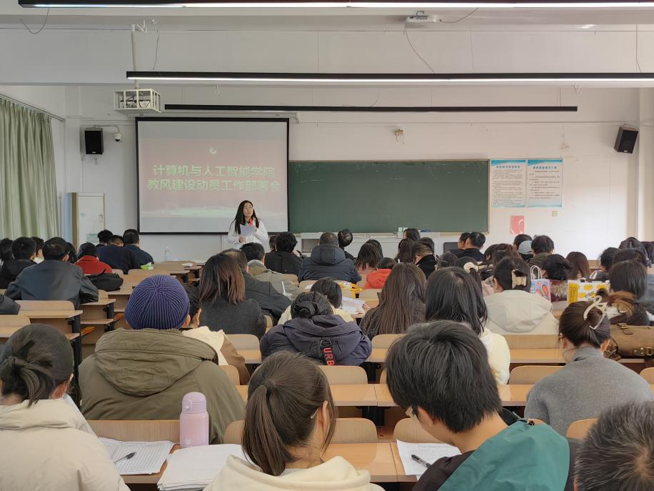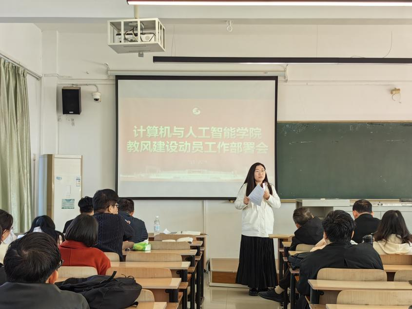 本网讯(通讯员 冯慧敏)为深入贯彻落实学校 “一训四风” 文化建设月活动要求,进一步强化学院教风建设,凝聚育人合力,共创文明和谐的校园文化氛围。11月19日下午,计算机与人工智能学院在1教201教室召开教风建设动员工作部署会。学院全体教师参会,会议由副院长黎丽主持。