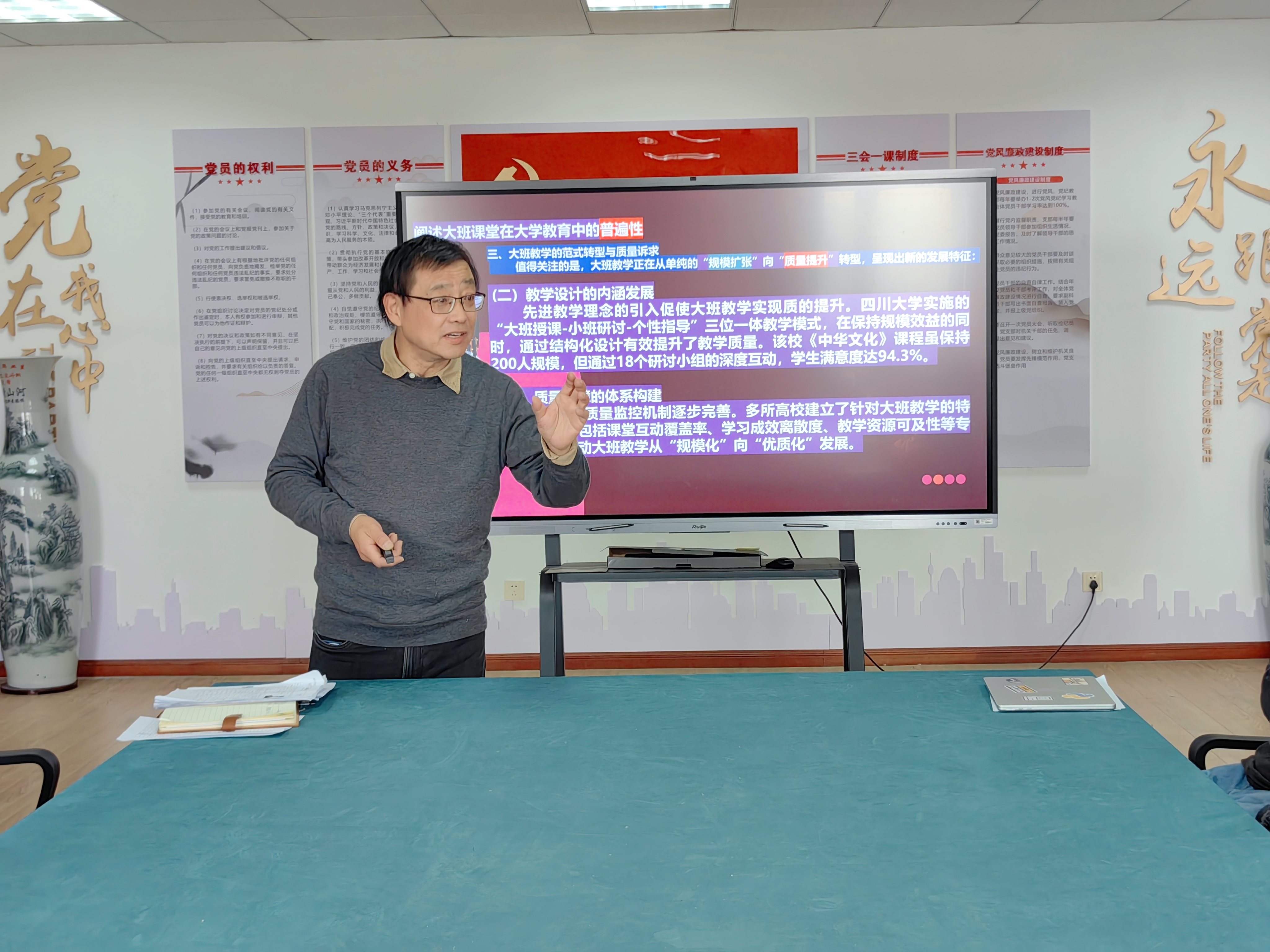会上,冯光华教授以 “大学教师大班课堂教学规范” 为核心主题,首先点明大班上课在大学教育中的普遍性,围绕教学全流程展开系统讲解。他强调,教师开展大班教学需先筑牢课堂秩序根基,明确量化管理标准;同时要主动与学生交心沟通,重点关心学业困难学生,搭建良好师生互动桥梁。针对教学质量提升,他提出 “新授 + 重复练习” 的核心模式,强调测试题需遵循 “简单、够用、少而精” 原则,同时推行 “大班授课 + 小班研讨 + 个性指导 + 项目式管理” 的多元教学模式,并鼓励教师充分整合教学资源。
